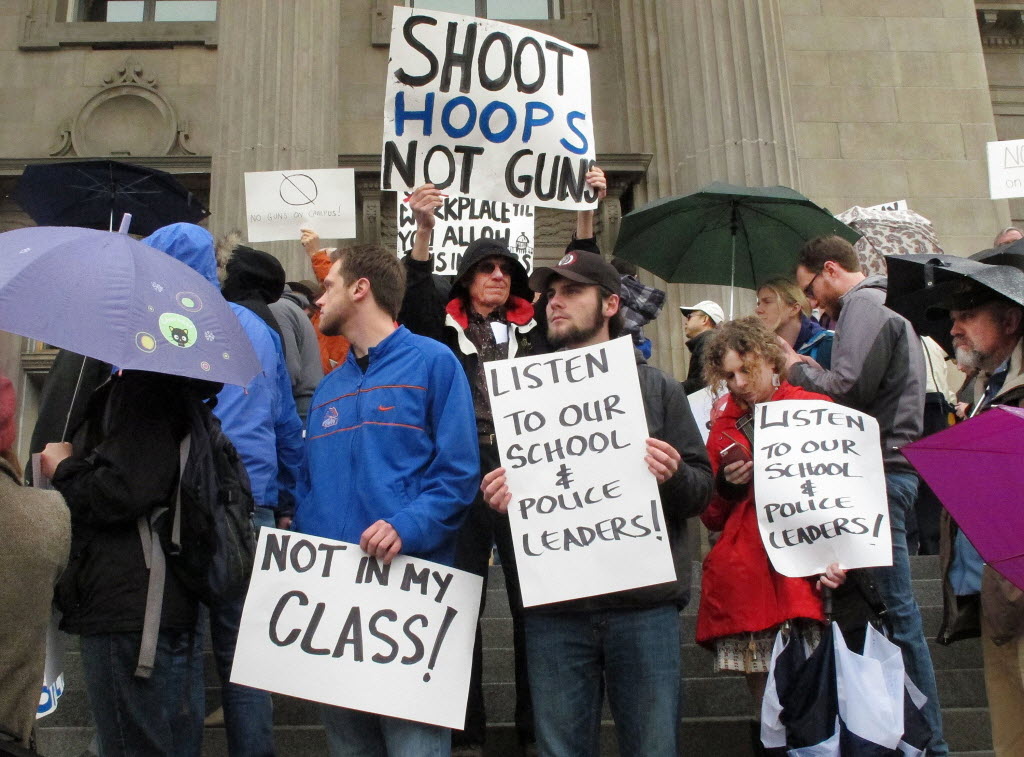 In this Feb. 27, 2014, file photo, protestors rally on the steps of the Idaho Statehouse in Boise to protest SB1254, a bill seeking to allow concealed weapons on the state’s college campuses. Idaho lawmakers are once again seeking to remove a special exemption that allows elected officials to carry concealed guns without a permit. The House State Affairs Committee voted today to introduce the bill, which would rewrite most of the state’s concealed weapon laws and clarify confusing sections. (AP Photo/John Miller, File)