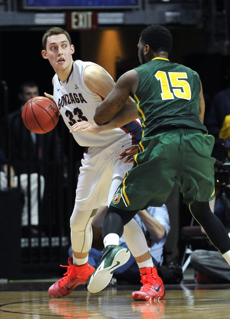 Gonzaga’s Kyle Wiltjer (33) looks to pass against San Francisco’s Kruize Pinkins during the quarterfinals of the West Coast Conference tournament Saturday in Las Vegas. Gonzaga won 81-72. (AP Photo/David Becker)