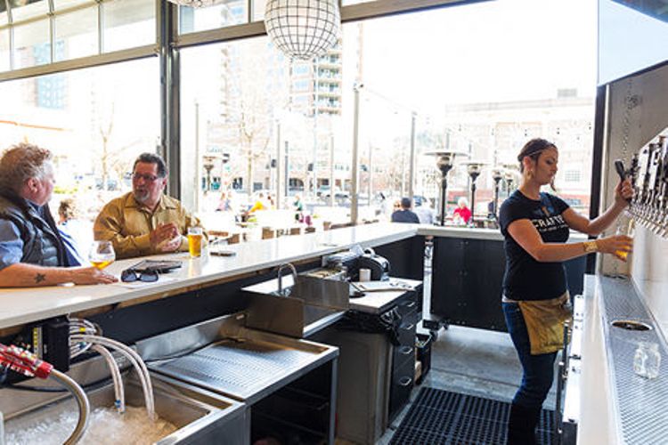 Tricia Whitney, supervisor at Crafted Tap House and Kitchen, pours a beer during her shift Tuesday at the Coeur d’Alene restaurant. (Coeur d’Alene Press photo: Shawn Gust)