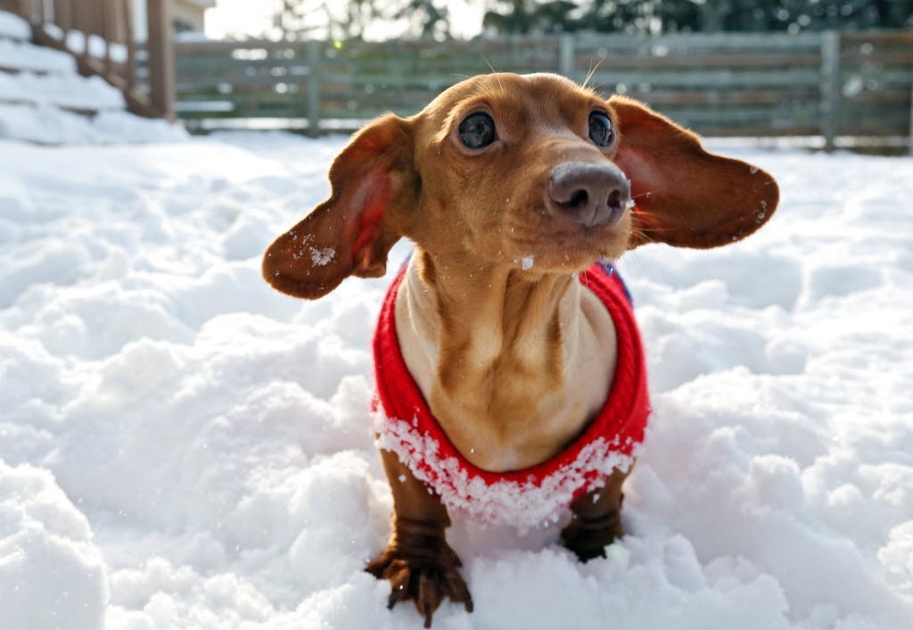Brooke Burton’s miniature dachshund Dennis stands in the snow in Columbus, Ohio. Once a wanton wiener dog, Dennis went on a diet and is now a happy shadow of his former self after losing more than 75 percent of his body weight. Less than two years ago, Dennis weighed in at a whopping 56 pounds. You write the cutline. (AP Photo/The Columbus Dispatch, Eric Albrecht)