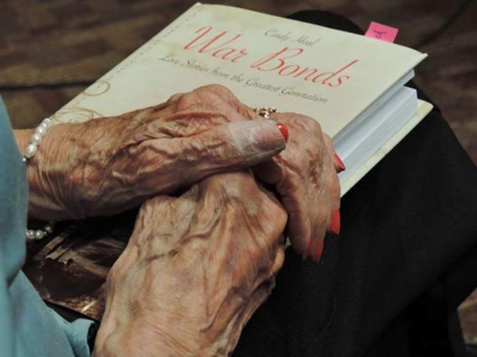 Donna Stafford holds her signed copy of Cindy Hval’s book, “War Bonds: Love Stories from the Greatest Generation,” Wednesday night. Donna and her husband were one of the couples featured in Cindy’s book. Donna attended Cindy’s reading from her book at the Coeur d’Alene Library. (Photo: Cindy Mitchell)