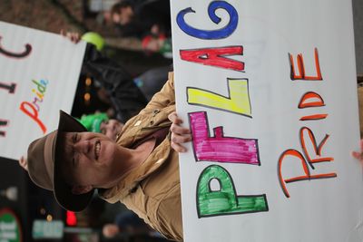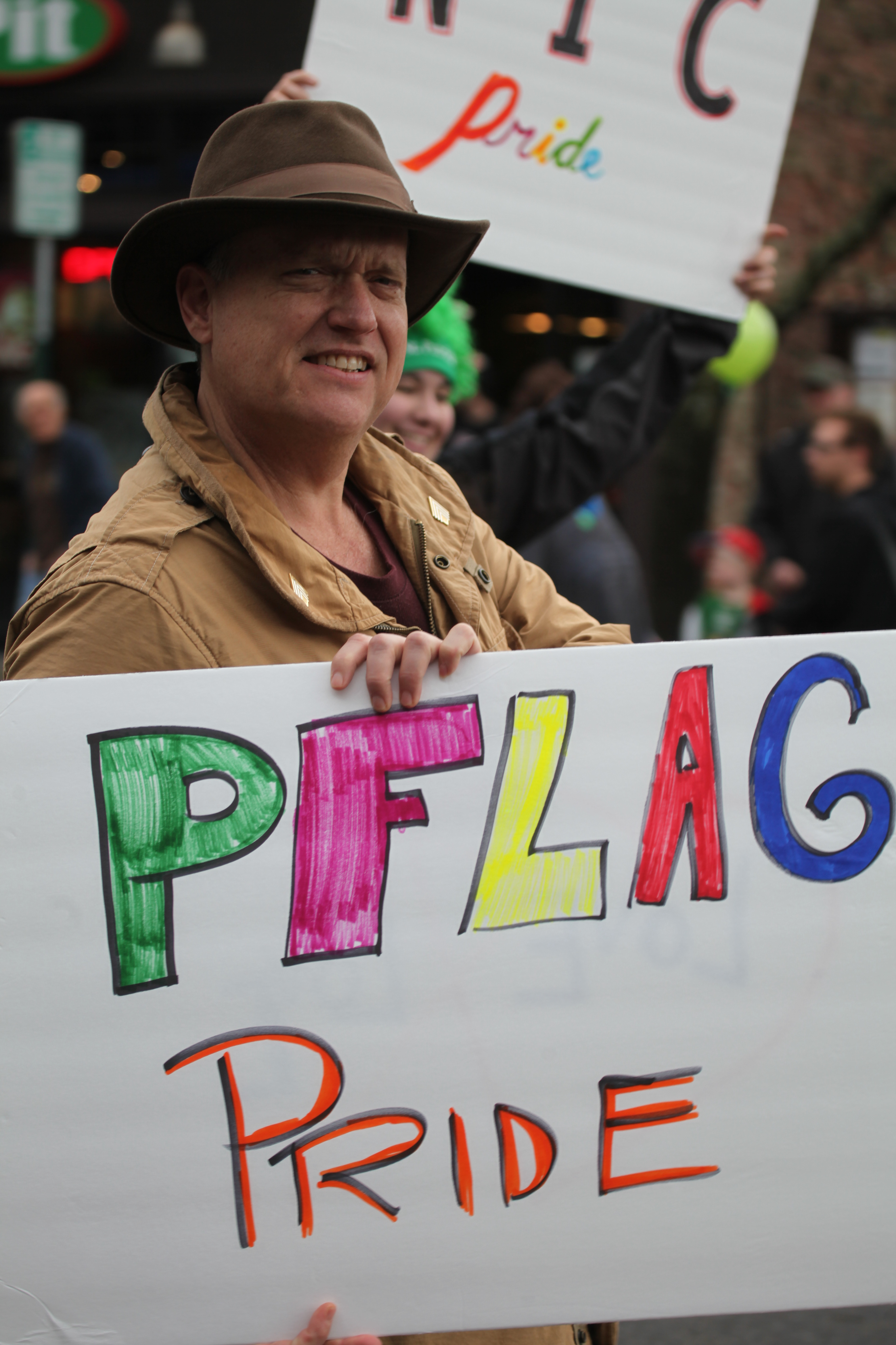 Coeur d’Alene Councilman Dan Gookin sports a flag as part of the new PFLAG (Parents, Family & Friends of Lesbians & Gays) Coeur d’Alene organization that took part in the St. Patrick’s Day Parade in downtown Coeur d’Alene Saturday. The PFLAG contingent was part of “the 25 entries that piped, drummed, danced, rolled, trotted and marched along Sherman Avenue,” according to the Coeur d’Alene Press. Others included the Coeur d’Alene Firefighters Pipes, Cherry Hill Park BMX, Ronald McDonald, the Snake Pit Derby Dames, Coeur d’Alene Chamber of Commerce, Irish wolfhounds, Irish setters, the guy in the Guinness can and more. (Photo: Duane Rasmussen)