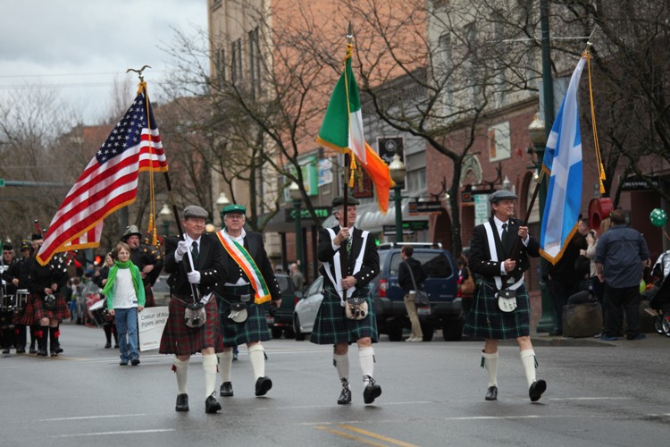 Here’s the color guard for Saturday’s Downtown Association St. Patrick’s Day celebration in Coeur d’Alene. The Grand Marshal is the fellow, second from the left, in the green-white-and-orange sash. (Photo: Duane Rasmussen)