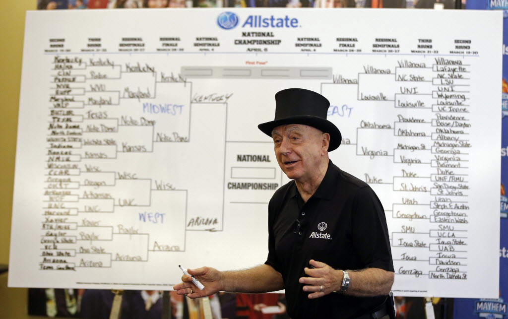 Basketball analyst Dick Vitale explains his tournament picks Tuesday in Indianapolis. Vital is going head to head with groundhog Punxsutawney Phil in a bracket-picking contest for the NCAA Tournament. Vitale picked Kentucky to win the tournament while Phil selected Villanova. (AP Photo/Darron Cummings)