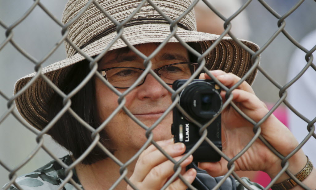 Seattle Mariners fan Jan Hainsworth, from Seattle, sticks her lens through the fence to get a photo during a Mariners’ practice prior to a spring training baseball game against the Oakland Athletics today in Peoria, Ariz. (AP Photo/Lenny Ignelzi)
