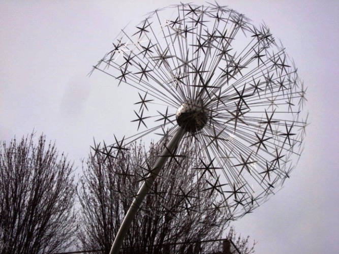 One of the favorite pieces of public art work in Coeur d’Alene is the relatively recently installed Allium Spring Chorus, by artist, David Tonnesen, at the Third Street entrance to McEuen Park and the boat launch. However, the art work appears to be a little too much like the dandelion that it seems to represent. Pieces are missing, as though the window has blown the dandelion seeds away, like those in your neighbor’s yard. Walkabout, who snapped this photo, reports seeing a child snatch a broken piece of the Spring Chorus that was lying on the ground. At first I blamed vandals, but city spokesman Keith Erickson tells Huckleberries Online that the art work arrived in Coeur d’Alene with pieces broken. The artist will repair the work some time in April or May.