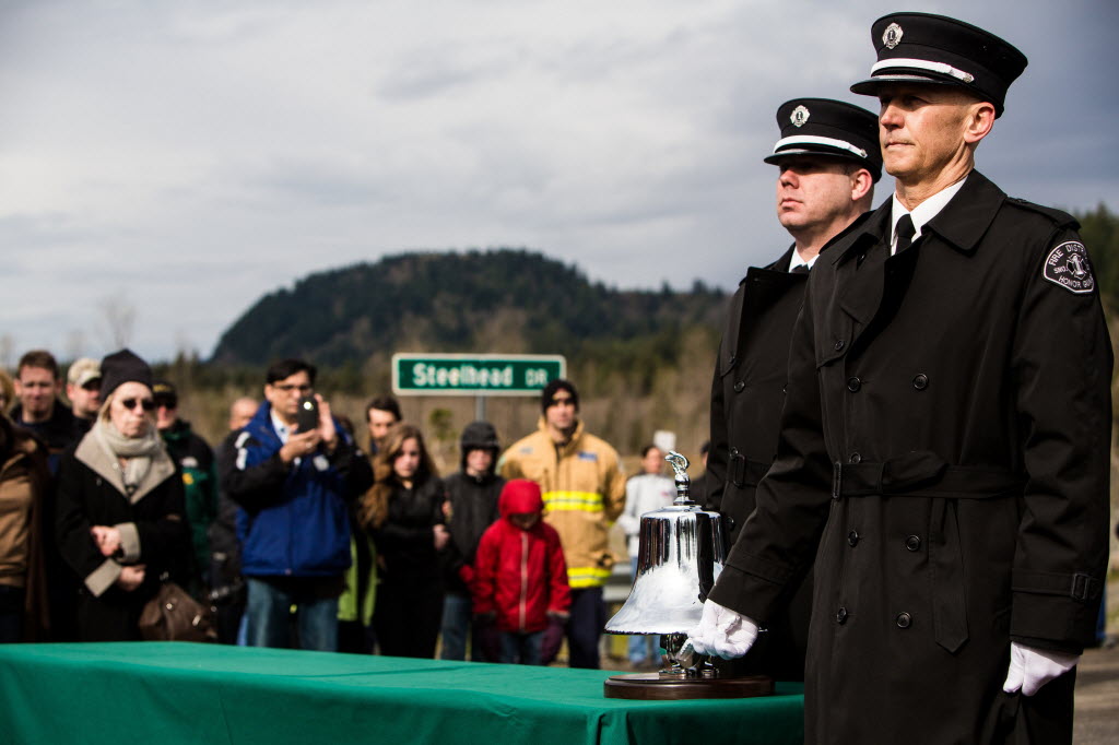 Honor Guard members ring a silver bell for each victim as fire department officials read off the names of victims who lost their lives in the Oso slide, as photographed Sunday, on the one year anniversary of the tragedy that left 43 dead in the town of Oso, Washington. Story here. (AP Photo/seattlepi.com, Jordan Stead)