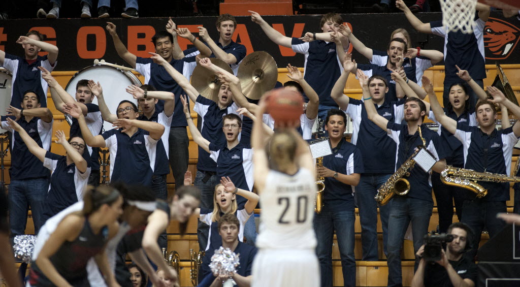 Gonzaga band members try to distract George Washington’s Hannah Schaible on her foul shot atempt, March 20, 2015, in the NCAA Women’s Basketball Championship first round game in Corvallis, Ore. (SR photo: Dan Pelle)