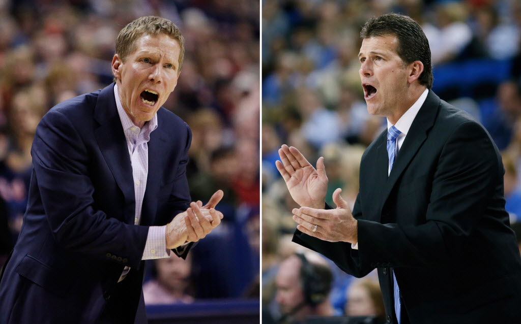 At left in a Feb. 28 file photo, Gonzaga head coach Mark Few instructs his team during a game against BYU in Spokane. At right, in a Feb. 11 file photo, UCLA head coach Steve Alford directs his team against Oregon State in Los Angeles. Gonzaga and UCLA play on Friday in the regional semifinals of the NCAA Tournament in Houston. You write the cutline. (AP Photo/File)