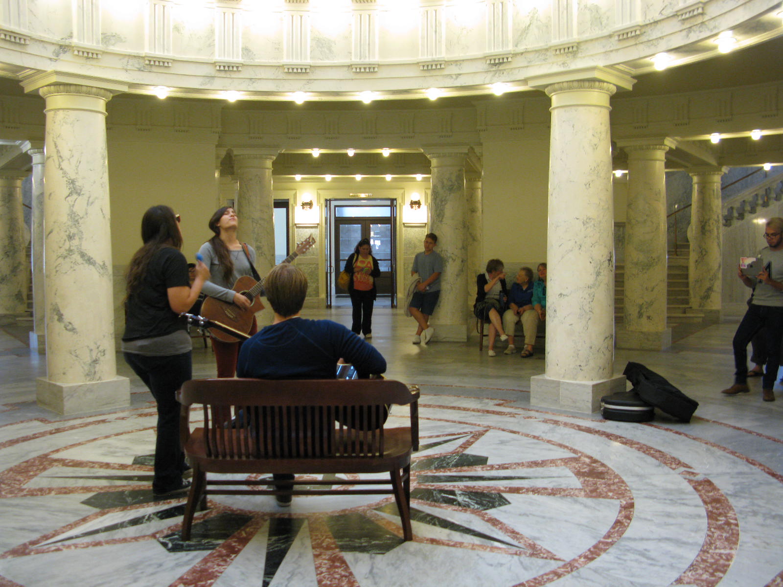 Artists from Treefort are performing in the first-floor rotunda of the Capitol right now, as part of an offshoot of the indie-rock music festival dubbed “Treefort.” Here, Alicia Murphy performs, filling the rotunda, all the way up, with sound; people are gathered here and there on upper levels to listen and watch.