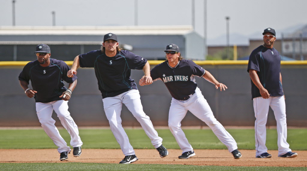Seattle Mariners’ Nelson Cruz, right, watches as three of his Mariner teammates practice their leadoff and start move in unison at a practice prior to a spring training baseball game against the Los Angeles Angels Monday in Surprise, Ariz. You write the cutline. (AP Photo/Lenny Ignelzi)