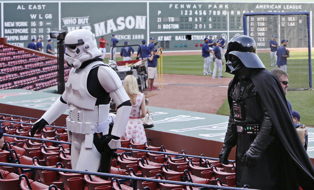 Star Wars characters dressed as Darth Vader, right and a stormtrooper walk through the stands prior to a baseball game between the Tampa Bay Rays and Boston Red Sox at Fenway Park in Boston today. Star Wars Day is observed by fans globally on May 4 with a slight change in the iconic catchphrase; from “May the Force be with you” to “May the Fourth be with you”. (AP Photo/Charles Krupa)