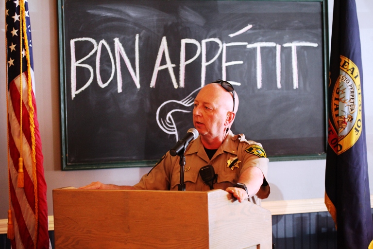 Kootenai County Sheriff Ben Wolfinger expressed his gratitude to the community at the Republican Women’s Club luncheon today at Tito’s Restaurant re: the outpouring of support for law enforcement and mourning in wake of the slaying of CPD Sgt. Greg Moore early Tuesday morning. Too overwhelmed by emotion and recent events to prepare notes, he said he would speak from his heart. Wolfinger urged the women to continue their support of business which had contributed money to the family of the fallen office. (Photo: Duane Rasmussen)