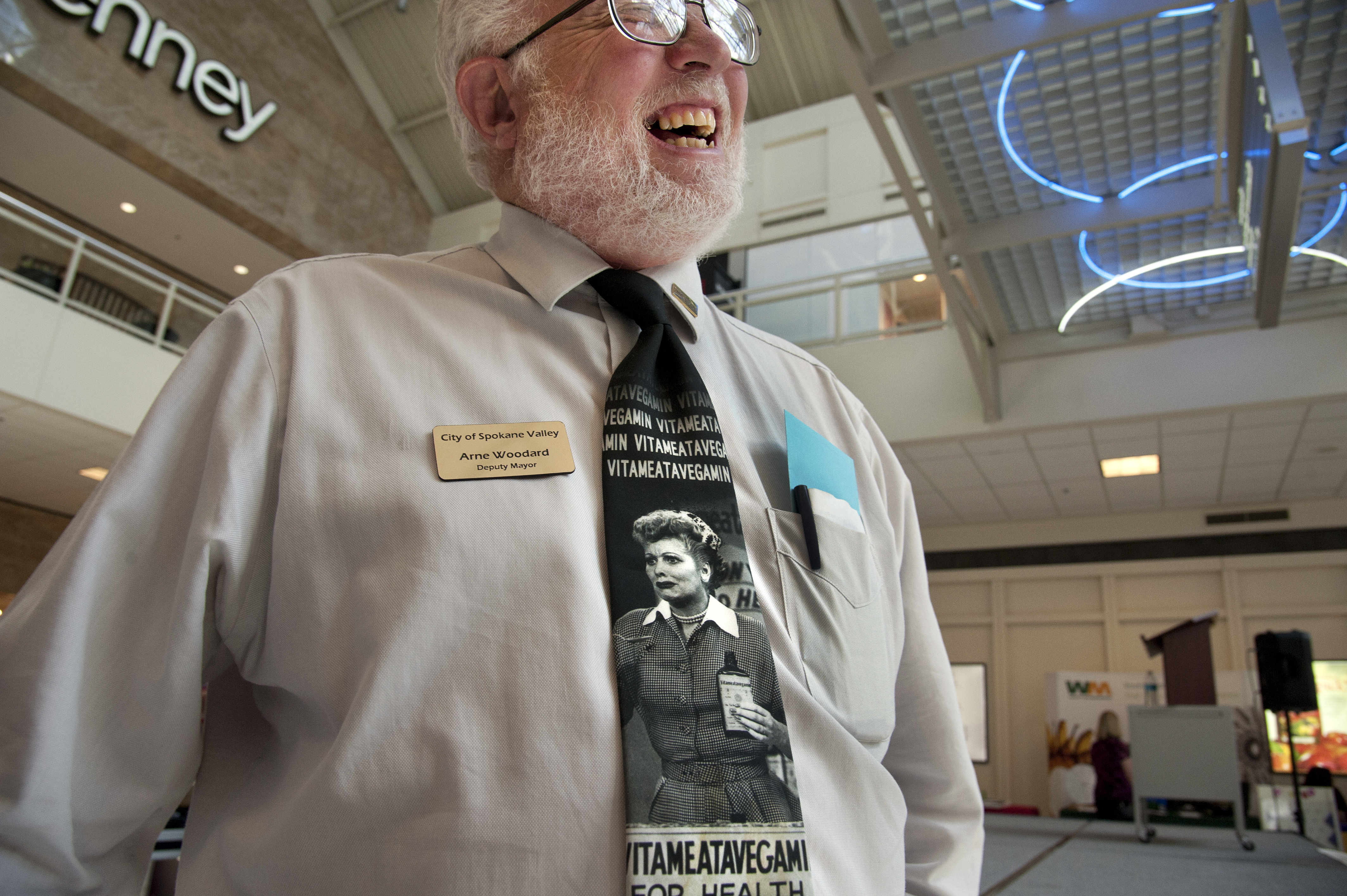 Spokane Valley Deputy Mayor Arne Woodard doesn’t really like to wear a tie, but he feels Valley residents deserve the respect a tie brings to the city council dais so he puts one on for the council meetings. Over the years, he has collected hundreds of ties and on Wednesday, at the Mayor’s state of the city address at Spokane Valley Mall he was sporting 1950s TV star Lucille Ball and her fictitious elixir Vitameatavegamin.