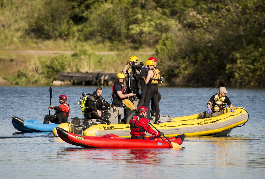 The Spokane County Sheriff’s dive team and other emergency personnel search the wreckage of a small plane that crashed into the Spokane River Thursday, near Felts Field in Spokane. Witnesses said two victims were pulled from the submerged plane. (SR photo: Colin Mulvany)