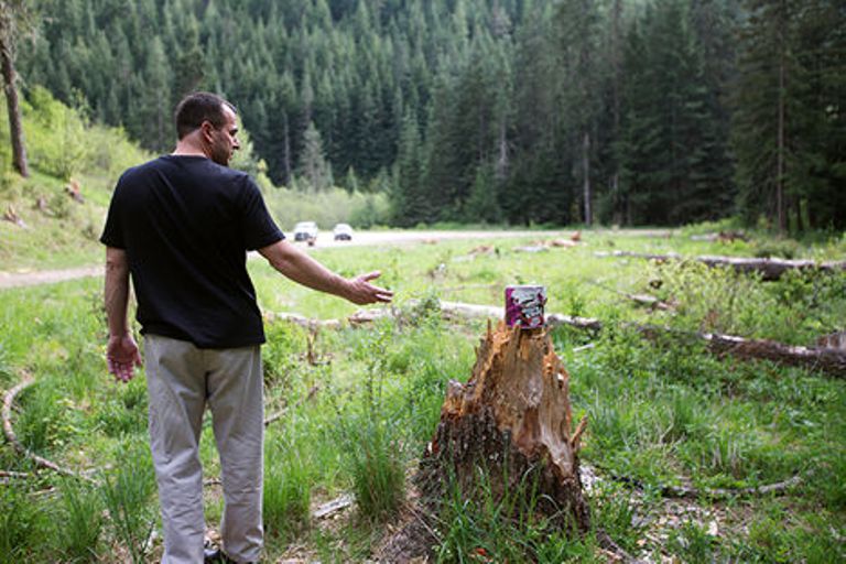 Brian Bunch points out a lone coffee can resting atop a shot down tree by Hayden Creek Tuesday. Brunch and a group of others plan to clean the remnants of a shooting range on Saturday. Story here. (Coeur d’Alene Press photo: Kristen McPeek)