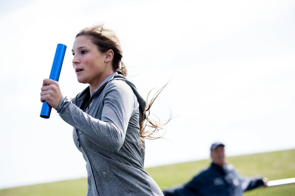 Maddison Ward carries the baton during practice at Lake City High school in Tuesday, May 12. She has signed to run at Idaho State University. Greg Lee’s SR story here. (SR photo: Kathy Plonka)
