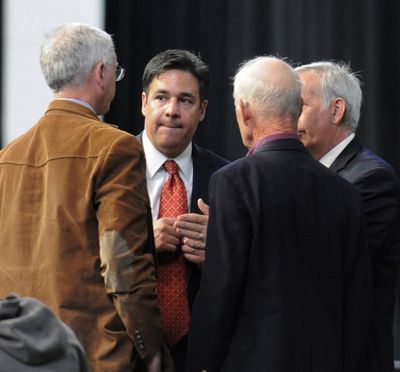 Congressman Raul Labrador talks with parliamentarians at 2014 Idaho GOP convention in Moscow (AP/Lewiston Tribune photo: Kyle Mills)