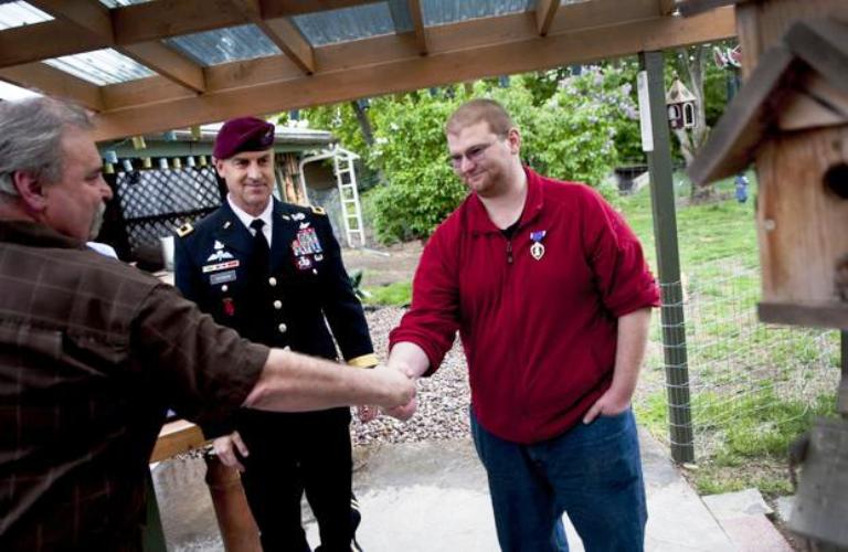George Stratton III shakes the hand of his father, George Stratton Jr., after receiving the Purple Heart from Army Brig. Gen. Erik Peterson at his father’s home in Post Falls on Wednesday. He was injured during a shooting rampage at Fort Hood in 2009. (SR photo: Kathy Plonka)