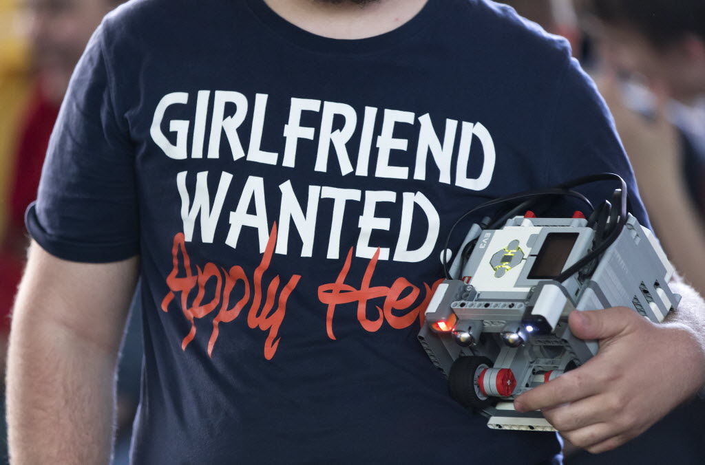 A Romanian student holds his sumo fighting robot while waiting to compete in the finals of the Infomatrix 2015 international computer science and robotics competition in Bucharest, Romania, earlier today. You write the cutline. (AP Photo/Vadim Ghirda)