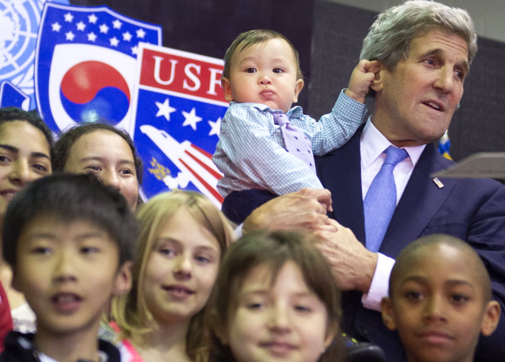 U.S. Secretary of State John Kerry, right, holds 8-month-old Andrew Belz as he poses for photos with the children of US troops and US Embassy personnel in Seoul today. You write the cutline. (Saul Loeb/Pool Photo via AP)