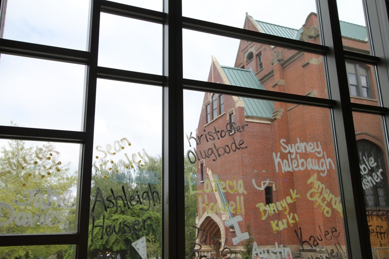At University of Idaho graduation ceremonies this weekend, photographer Duane Rasmussen snapped a series of shots for himself and Huckleberries Online, including this one of names of graduates painted on a window of the business department building.