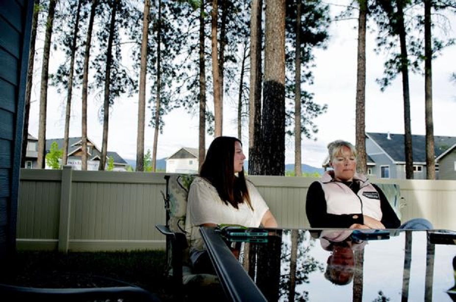 Greg Moore’s wife, Lindy Moore, left, meets with his ex-wife, Jennifer Brumley, at Moore’s home in Coeur d’Alene on Thursday. (SR photo: Kathy Plonka)