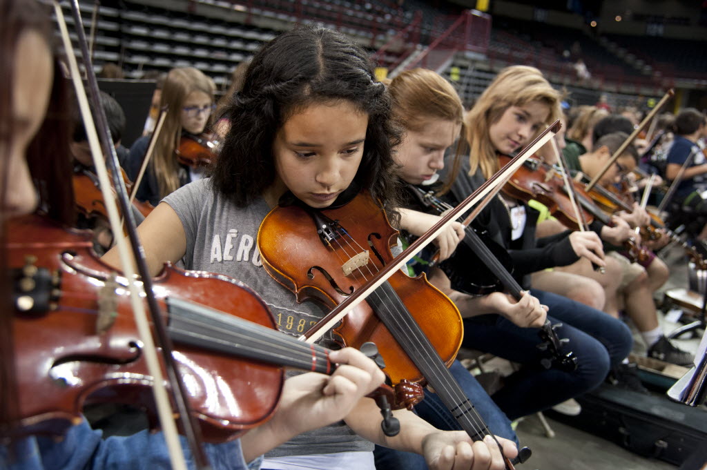 Trinity Pablo, Whitman Elementary school 5th grader, and some 2600 Spokane Public School students practice in the Spokane Veterans Memorial Arena Tuesday morning, for the evening’s Band and String Spectacular. (SR photo: Dan Pelle)