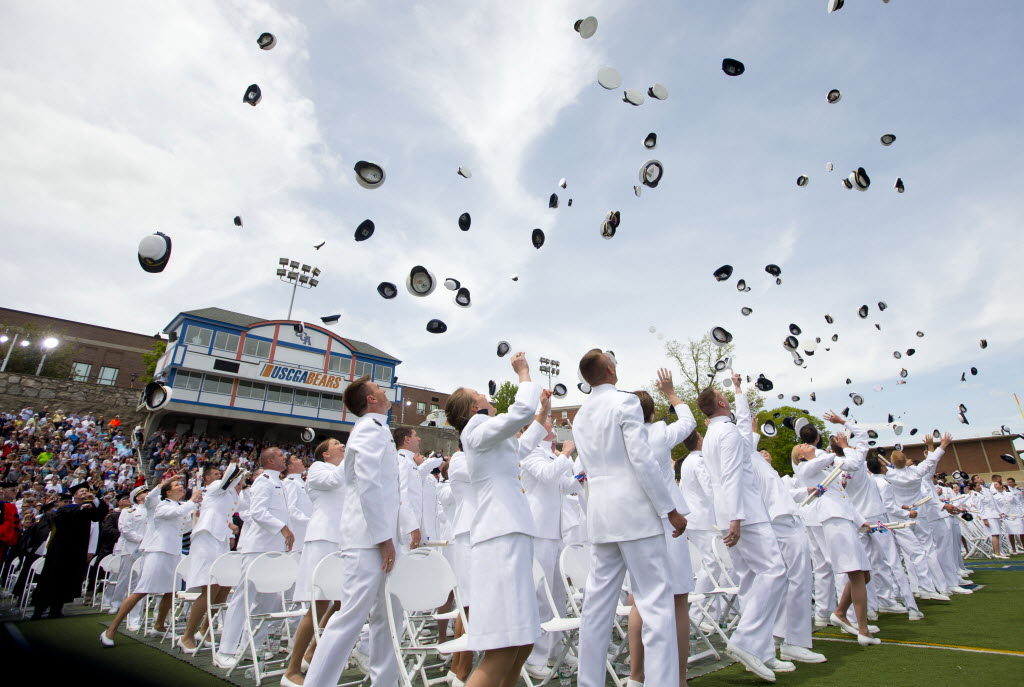 Members of the graduating class of 2015 U.S. Coast Guard Academy throw their hats in the air near the end of their ceremony in New London, Conn., Wednesday. (AP Photo/Pablo Martinez Monsivais)