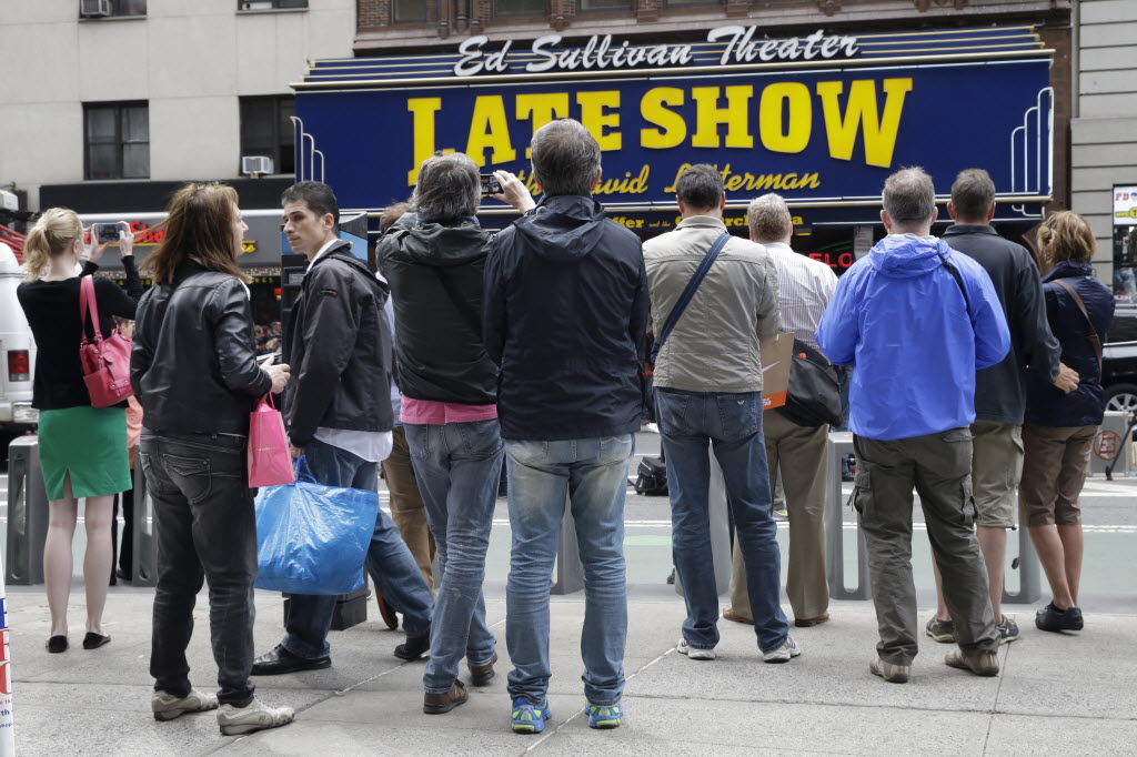 People assemble outside the Ed Sullivan Theater in New York during the final taping of the CBS “Late Show with David Letterman” today. Letterman. Letterman signed off Wednesday after 33 years and 6,028 broadcasts of his late-night show. (AP Photo/Mary Altaffer)