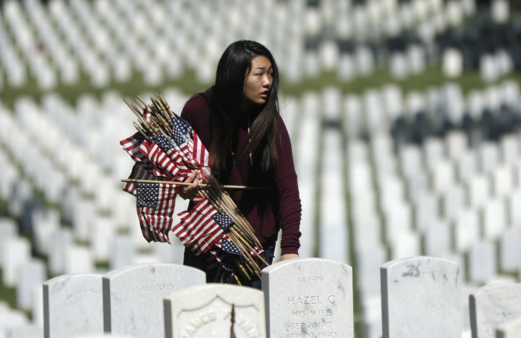 Earlier today, Horace Mann Magnet School student Jennifer Song places flags at Little Rock National Cemetery in recognition of Memorial Day in Little Rock, Ark. (AP Photo/Danny Johnston)