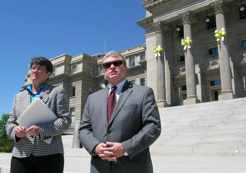 U.S. Attorney for Idaho Wendy Olson, left, and Idaho Attorney General Lawrence Wasden, right, announce final settlement Thursday afternoon on accessibility improvements to Idaho’s renovated state Capitol. Longtime Idaho disability-rights leader Kelly Buckland calls Capitol ADA settlement ‘bittersweet’. Story here. (Betsy Z. Russell)
