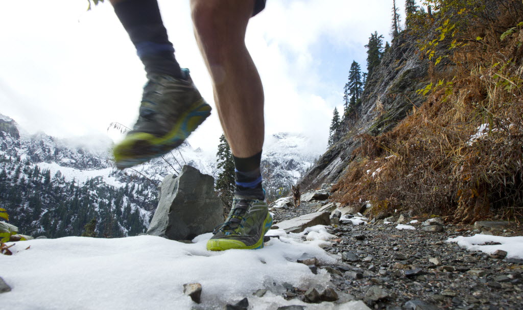 Andrew O’Connor and his dog Pepper run on Snow Lake Trail, Tuesday, above Snoqualmie Pass in Washington state. Some of the first snow of the season fell in the area over the weekend, but that didn’t stop several hikers from enjoying the trail. (AP Photo/Ted S. Warren)