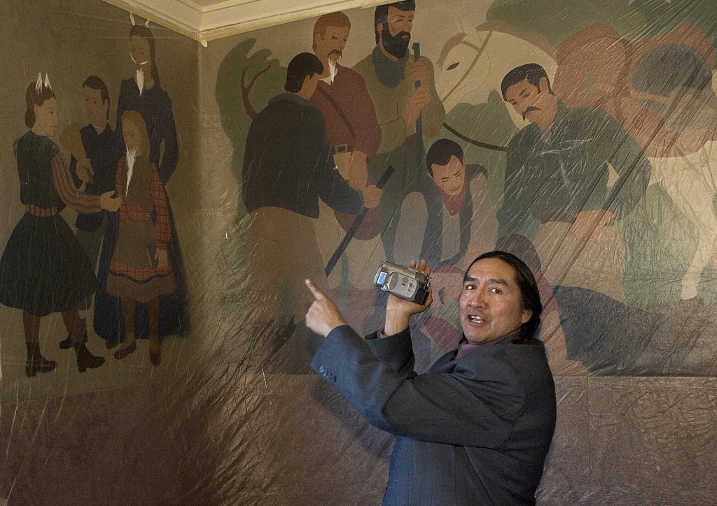 In this Jan. 17, 2007, file photo, Shoshone-Bannock Tribes Vice Chairman Lee Juan Tyler talks with others from his group while shooting some video of murals depicting the lynching of an Indian during a tour of the old Ada County Courthouse in Boise. State officials are hosting a public hearing to determine if two historic murals should remain hidden from the public view. The murals include scenes of white settlers preparing to hang Native Americans. The paintings have caused controversy in the past, but now Idaho’s Historical Society is objecting to covering up the murals, calling them a part of the state’s history that the public can learn from. Story here. (AP Photo/Matt Cilley, File)