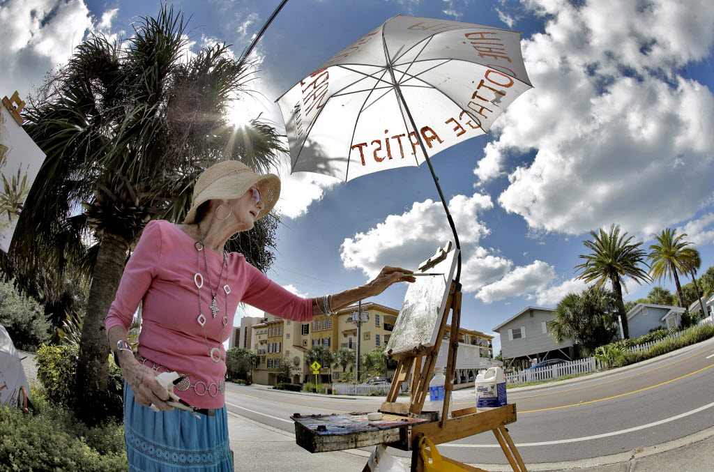 Mary Rose Holmes, one of The Plein Aire Cottage Artists, paints beach side cottages along Gulf Boulevard Thursday in Indian Rocks Beach, Fla. The group of three artists hopes to help preserve through art, the historical Gulf of Mexico beach front cottages. (AP Photo/Chris O’Meara)