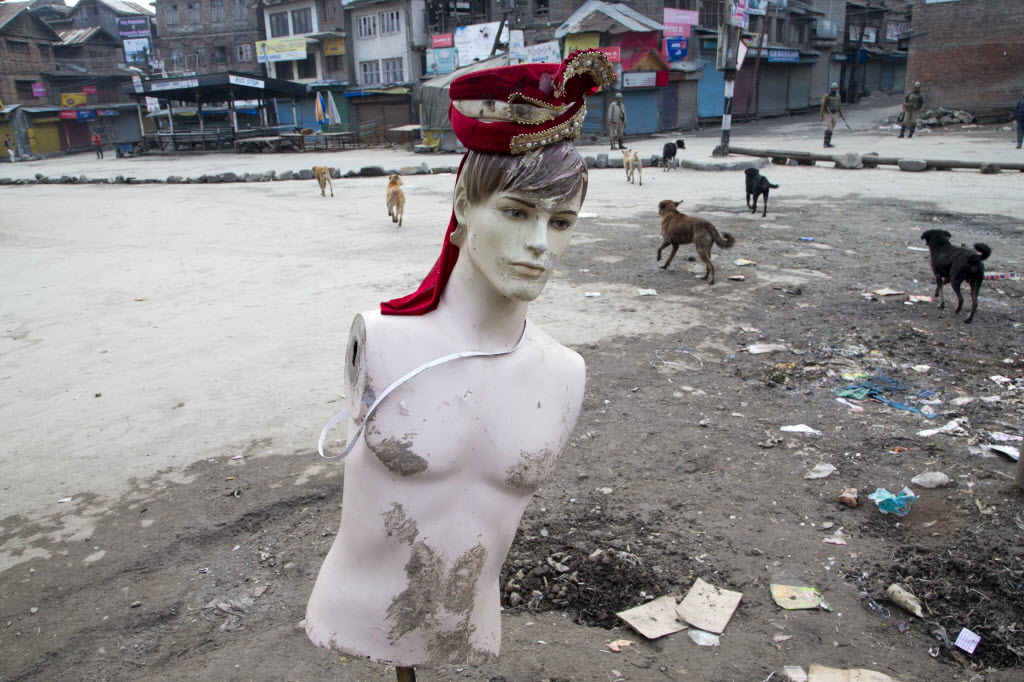 Stray dogs roam a deserted street with a mannequin erected by the side of a road during restrictions in Srinagar, Indian controlled Kashmir, Friday. Authorities imposed curfew in some parts of Himalayan Kashmir on Friday as government forces swept through the disputed region to stop anti-India protests ahead of the Indian prime minister’s visit.(AP Photo/Dar Yasin)