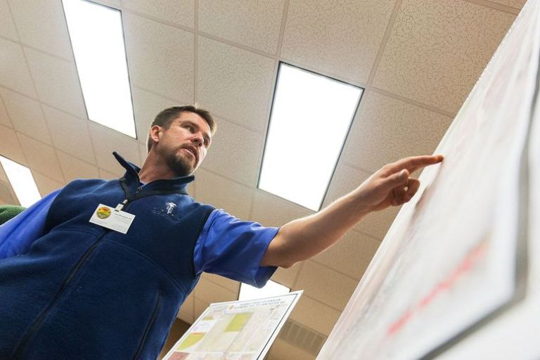 Sean Hoisington, director of public works for the City of Hayden, describes the Ramsey Road project using a printed display board during an open house at city hall. Story here. (Shawn Gust/Press photo)