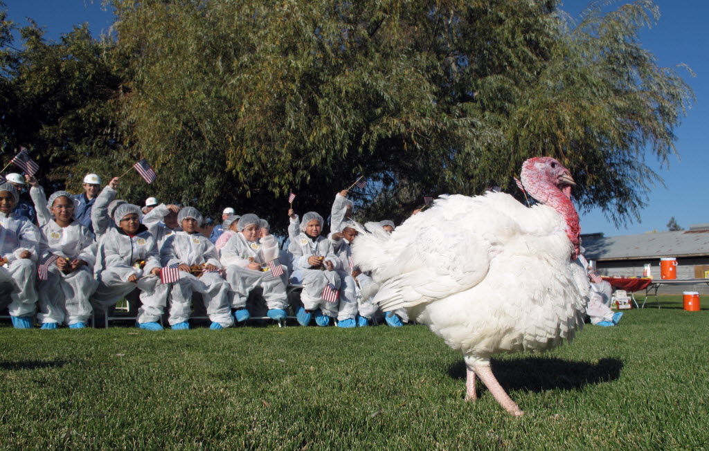 A turkey is selected for a pardon from the Thanksgiving dinner table by President Obama. On Thursday, a class of fifth grade students from nearby Eisenhut Elementary School in Modesto, Calif., cheered for their favorite as Foster Farms staffers picked the prized bird. The lucky turkey was selected on Thursday for a trip to the White House, where President Obama will pardon it in an annual tradition. You write the cutline. (AP Photo/Scott Smith)