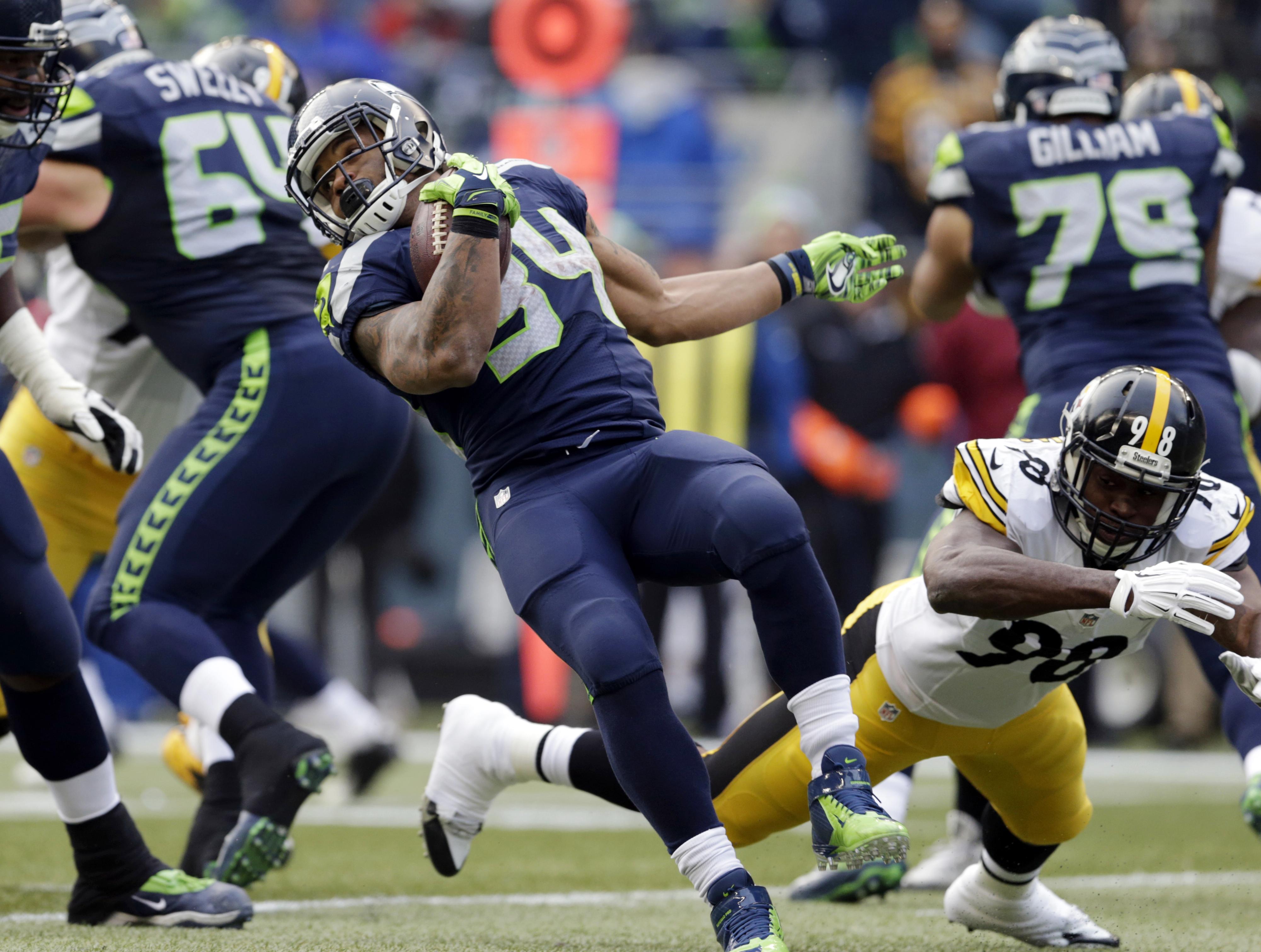 • So far this season the Hawks haven’t passed many tests. They flunked in Green Bay. At home against Carolina and Arizona. The outlook for the postseason was looking bleak. And Ben Roethlisberger was carving them up. So what did they do? Turn up the defensive pressure? Allow the 12s to disrupt the Steelers’ offensive flow? Nope. They turned to the past. Angry Doug Baldwin showed up. And with him came Fleet-Footed Doug Baldwin , who scampered down the right sideline for an 80-yard, game-clinching touchdown catch and run (pictured) with 2 minutes left. Yes, Russell Wilson had his best day of his Seahawk career – on his birthday . While battling “flu-like” symptoms, no less. ( As an aside, last week my two sons went out to celebrate one of their birthdays and they battled “flu-like” symptoms all the next day. I’m reasonably positive Wilson’s symptoms were not akin to theirs.) Not only did Wilson throw for 345 yards, completing 21-of-30 passes, he tossed five touchdown passes, three of them to Baldwin. And the Hawk offense converted third-and-long time after time – Baldwin’s 80-yard game clincher came on third-and-10 – to frustrate the Steelers. Not that Pittsburgh’s defense is what it used to be, but then again whose is? Certainly not Seattle’s. The Legion of Boom gave up almost 500 passing yards, though it did come up with four interceptions, including Richard Sherman’s first of the season. Roethlisberger threw for 456 yards himself, until one too many hits forced him to the sidelines after he self-reported concussion symptoms. That’s a smart man. The Hawks didn’t hit him all that often Sunday but on the Steelers’ late-game drive that ended in a field goal, they got to Roethlisberger twice – once after he delivered another strike (they were flagged for a hit on the helmet) and, on the last play, when he scrambled – a slow-motion scramble to be sure – for a short gain inside the 10-yard line. The Steelers kicked a field goal to close within two but their plan to hold and get the ball back failed in the first regard. Baldwin raced to the end zone and the Steelers had to turn to Landry Jones for any type of comeback. It wasn’t happening. So now the Hawks are actually in the playoff hunt – they hold the sixth spot right now thanks to a tiebreaker with Atlanta – with another huge game looming next Sunday in Minnesota . It’s also another test. And only an A-effort will do .