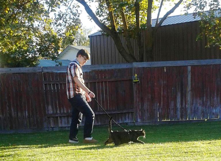 Cindy caught this fellow walking a cat on a leash somewhere in her Spokane hood.