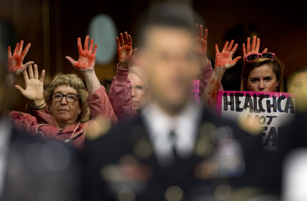 Members of CodePink protest the deadly U.S. attack on a hospital in northern Afghanistan on Capitol Hill in Washington on Tuesday, during the Senate Armed Services Committee hearing on the Situation in Afghanistan, as U.S. Forces-Afghanistan Resolute Support Mission Commander Gen. John Campbell testifies. (AP Photo/Carolyn Kaster)