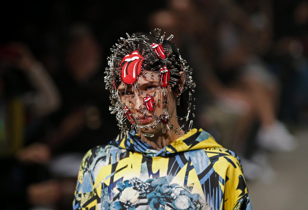 A model displays creations by PLASTICTOKYO designer Keisuke Imazaki during the 2016 Spring/Summer show at Tokyo Fashion Week Tuesday. You write the cutline. (AP Photo/Shuji Kajiyama)