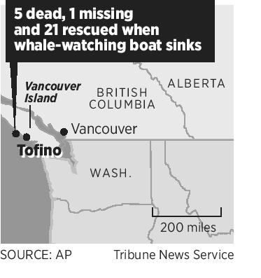 TOFINO, British Columbia – Five British nationals died when a whale watching boat with 27 people on board sank off Vancouver Island, the British Foreign Minister said Monday. An Australian man was missing and the rest were rescued, some by members of the local aboriginal community who rushed to help.