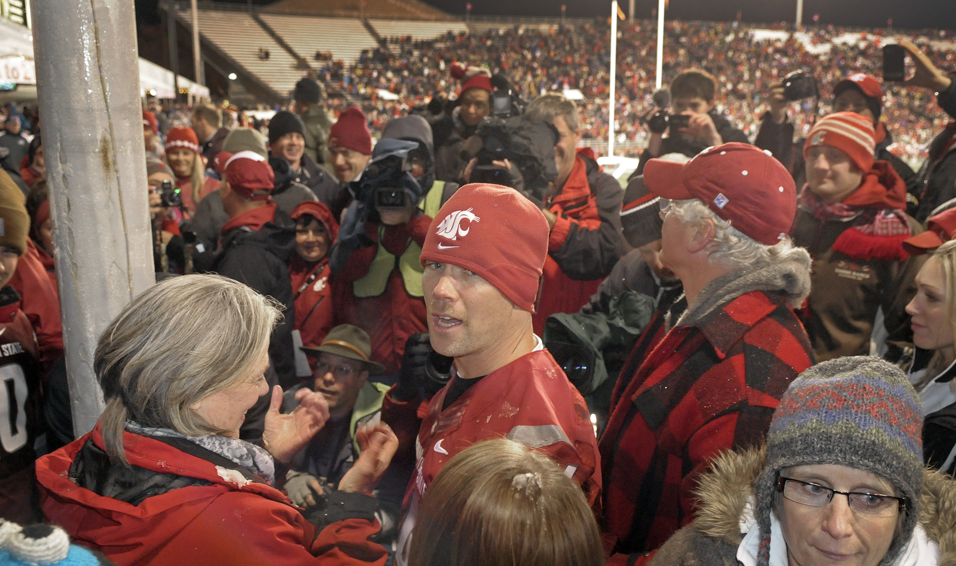 • If you have a Twitter machine and follow folks with Washington State ties, you would have thought yesterday was Halloween, Christmas Eve and the last day of school, all rolled into one. For 9-year-olds. No, I’m not calling Cougar fans 9-year-olds. It’s just they have the enthusiasm of that demographic when waxing poetic about “College GameDay,” ESPN’s early morning college football show. By now you know the drill. GameDay (as its friends call it) has been around in its present form for more than two decades. And, starting on Oct. 18, 2003, there has been a WSU flag waving in the background on every show. It’s waved in places as varied as Tuscaloosa, Alabama to Madison, Wisconsin. From Las Angeles to University Park, Pennsylvania. All over the United States, never missing an appearance. It’s feted by ESPN and allowed in spots others don’t dare disturb. Its travels are tracked and, as happened earlier this year, if something unforeseen happens, folks from around the country rally to keep the 171-appearance streak alive. But why does it happen? Mainly because, way back in 2003, Cougar fans wanted the GameDay set to make an appearance in Pullman. Back then WSU was a power, en route to its third consecutive 10-win season and top-10 ranking. Since then? Not so much. So the flag has waved in the wilderness – occasionally, literally, if you consider some of the sites like Waco and Fargo – hoping someday WSU would become relevant enough GameDay would have to actually consider the Palouse. That day has arrived. Well, actually, it arrived Saturday night. And continued Sunday. ESPN is considering the Palouse. And Philadelphia, where undefeated Temple – Bill Cosby’s alma mater, I may add, if that’s any help – will be hosting Notre Dame in the school’s biggest football game ever. That’s not happening this Saturday night in Pullman – the game with Stanford is a big deal, but not the biggest – but, at 5-2 and 3-1 in the Pac-12, Washington State is relevant again. And it is playing for the Pac-12 North lead. The Cougars feature one of the most prolific passing offenses in America. The defense is improved. They have special teams. And also America’s most motivated fan bases, as far as a GameDay appearance is concerned. However, there are problems. Washington State is hosting the Pac-12 cross country championships this Friday in Colfax. Such an event, while not the overpowering draw as, say, the Pac-12 football championship, still has tied up most if not all the available room space in the greater Pullman area, especially considering there is a football game as well Saturday night. The ESPN people have to be struggling to find room at the inn, if you want to give it a biblical bent, and I’m sure there is no way Kirk Herbstreit is bedding down in a stable, even if Lee Corso was born in one. So where does that leave Pullman and WSU fans , who spent Sunday refreshing their Twitter feeds? On pins and needles, waiting for the decision today. Whatever it is, there will be a disappointed fan base. But just one of them waves a flag every week, and has for a dozen years, hoping to be invited to the prom. Maybe this week the BMOC will take notice.