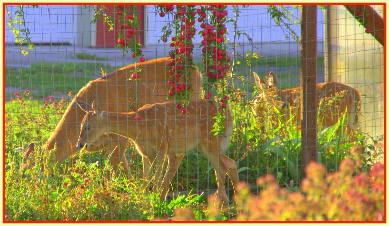 “Not the highest quality of photos but good enough as I stood quietly with the sliding glass door nudged open enough to point the camera toward the thieves,” posts Marianne Love/Slight Detour. “I knew they were coming because I had seen them scoot across Pasture No. 2. So, I put the dogs in, figuring they’d show up for another helping of plums.” More here.
