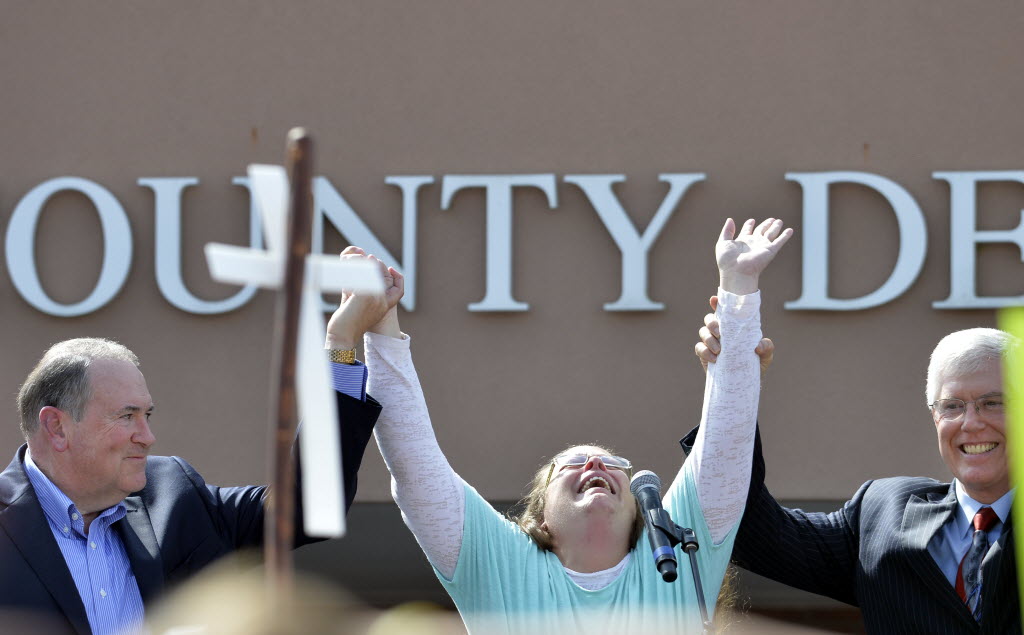 Rowan County Clerk Kim Davis, center, with Republican presidential candidate Mike Huckabee, left, and attorney Mat Staver, founder of the Liberty Counsel, the Christian law firm representing Davis, at her side, cries out after being released from the Carter County Detention Center today in Grayson, Ky. Davis, the Kentucky county clerk who was jailed for refusing to issue marriage licenses to gay couples, was released Tuesday after five days behind bars. (AP Photo/Timothy D. Easley)