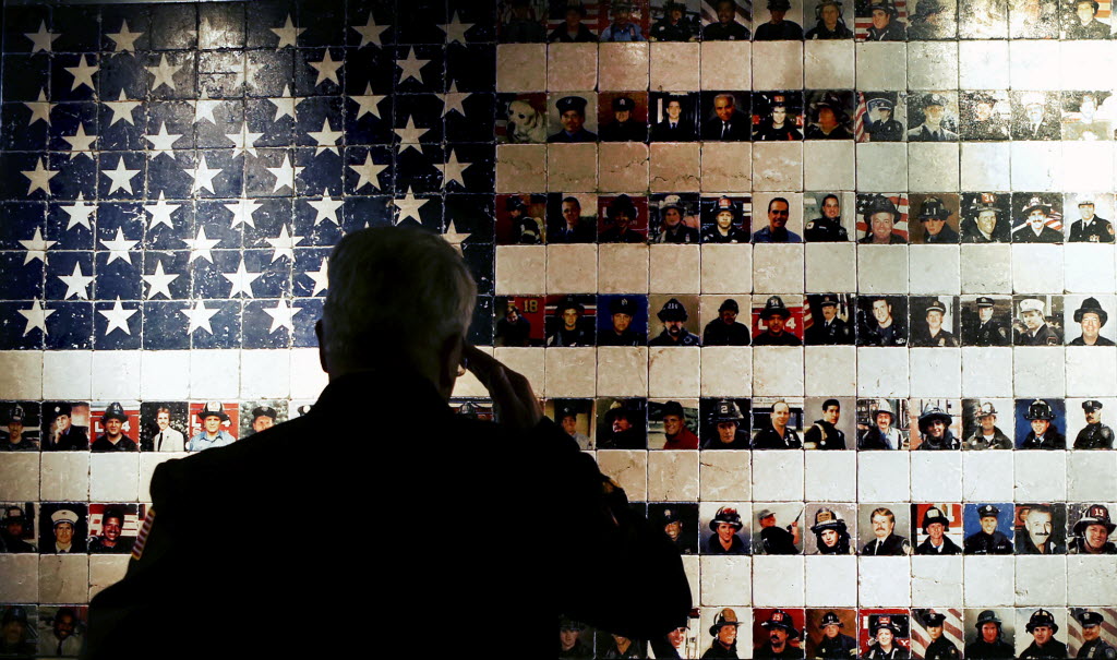 A fireman salutes a memorial honoring first responders who perished in the Sept. 11, 2001, terror attacks today in Memphis, Tenn.. Americans marked the 14th anniversary of the Sept. 11 attacks in countless ceremonies, small and large, on Friday. (Yalonda M. James/The Commercial Appeal via AP)