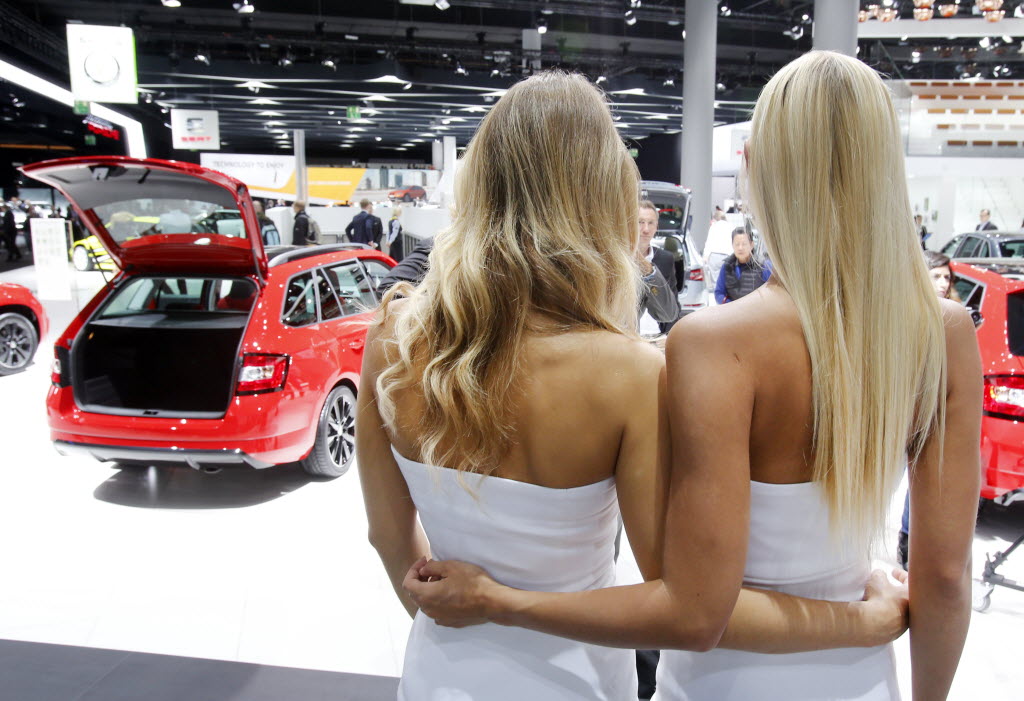 Two models pose near a Volkswagen on the second press day of the Frankfurt Auto Show IAA in Frankfurt, Germany Wednesday. You write the cutline. (AP Photo/Michael Probst)
