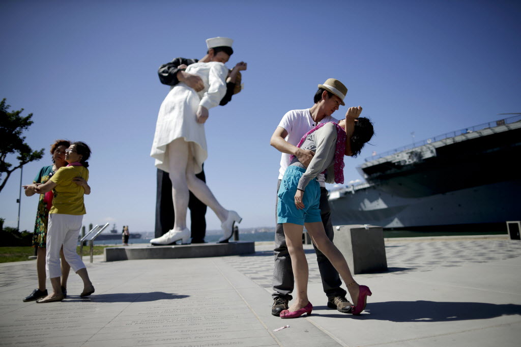 Jie Quan of China, dips Juan Wang, also of China, as they pose for family members in front of the sculpture “Unconditional Surrender,” earlier today in San Diego. The sculpture by Seward Johnson is inspired by Alfred Eisenstaedt’s iconic photo of a sailor kissing a nurse in Times Square on V-J Day. (AP Photo/Gregory Bull)