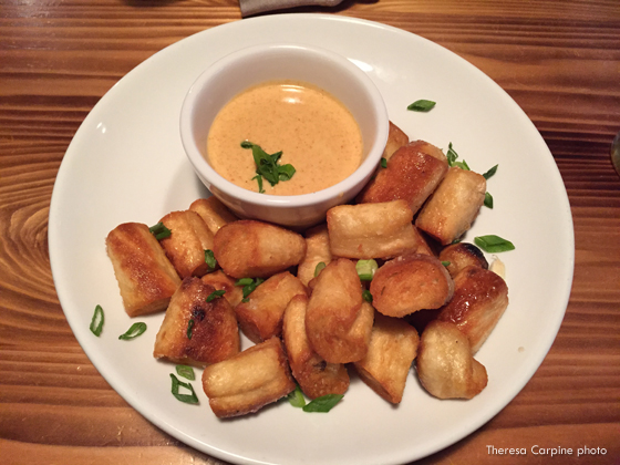 And lucky we did, because we decided to try the Pi Bites before our pizzas (Dalton for me, Wilson for him, although we always split). The appetizer is baked and pan-fried bits of pizza dough topped with sea salt, and served with cheese dip made with Perry Street Brewing Kolsch.